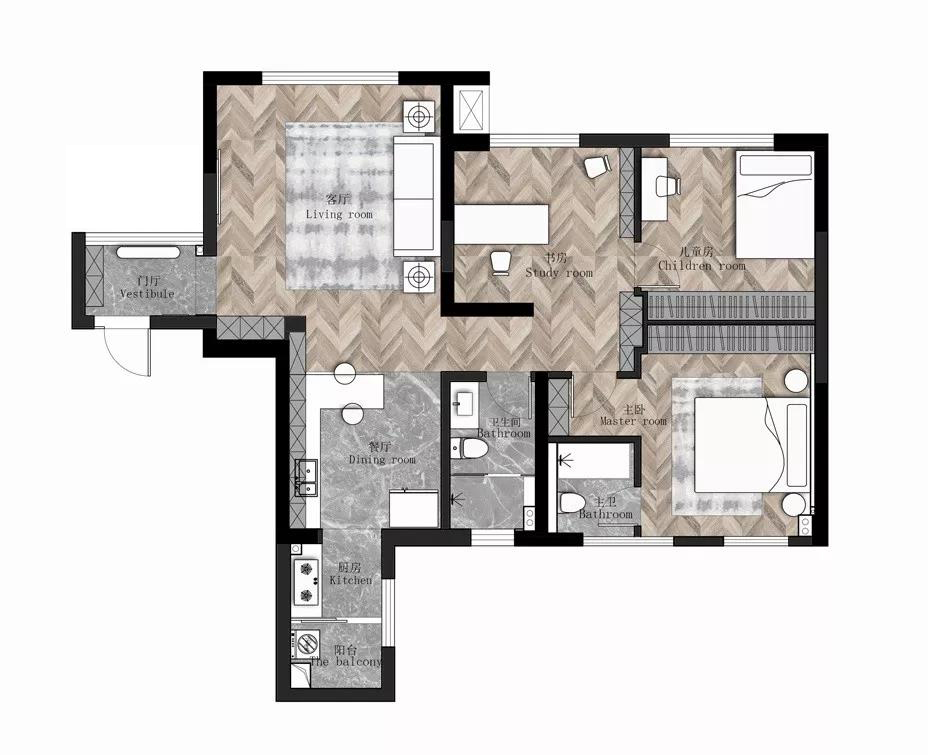 當(dāng)你想把生活過(guò)精細(xì)的時(shí)候,它就會(huì)變成無(wú)數(shù)個(gè)細(xì)小的片段,點(diǎn)燈、煮酒、烹茶、觀花。其實(shí),生活就是由每一天的瑣碎小事組成的。本案擯棄多余繁雜,讓每個(gè)細(xì)節(jié)存在合理且恰到好處,將現(xiàn)代藝術(shù)風(fēng)格與金屬元素碰撞出生活獨(dú)有的精致與高雅。踏入客廳,感受現(xiàn)代與古典的融合,幾何拼接地毯置于黑金茶幾下,穩(wěn)重利落且格調(diào)非凡。線條多而不雜,空間飽滿的質(zhì)感得以體現(xiàn)。精致擺件將空間的奢華感突顯無(wú)疑,利用金屬元素盡顯優(yōu)雅大氣,一點(diǎn)綠植為空間增添絲絲柔和的生活氣息。