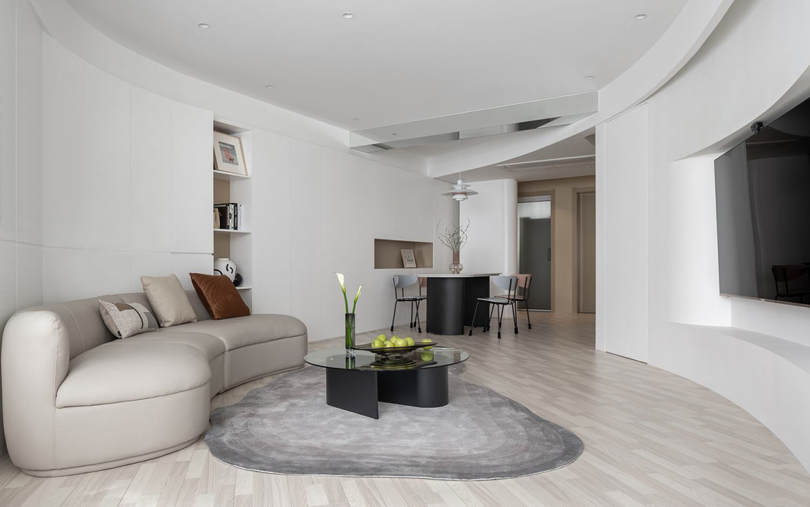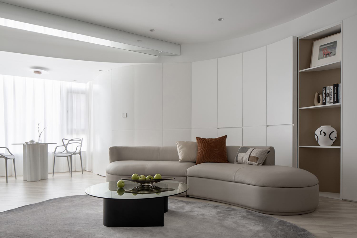 以白色的墻面為基底搭配大量的木質(zhì)加之利落的金屬元素,木材溫潤的色澤給空間帶來質(zhì)樸的舒適感。細膩的光線透過通透的玻璃與清幽的綠植,溫潤了空間的觸感,賦予空間自然純粹的氣質(zhì),營造一個陽光滿屋的生活空間優(yōu)雅柔軟的白色毛毯自然隨性的搭在充滿歷史感的復古皮質(zhì)沙發(fā)上,加之實木茶幾、原木色單椅、精致的藝術(shù)裝置品及燈具為空間提高藝術(shù)質(zhì)感的同時,愜意的居家氣息撲面而來,溫暖而獨特。生活藝術(shù)化,是人生美好的狀態(tài),也是人類不息追求的至鏡。