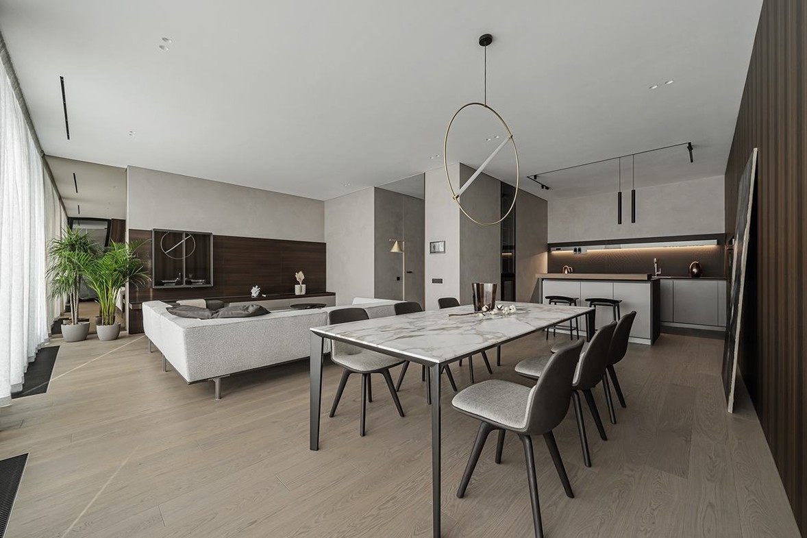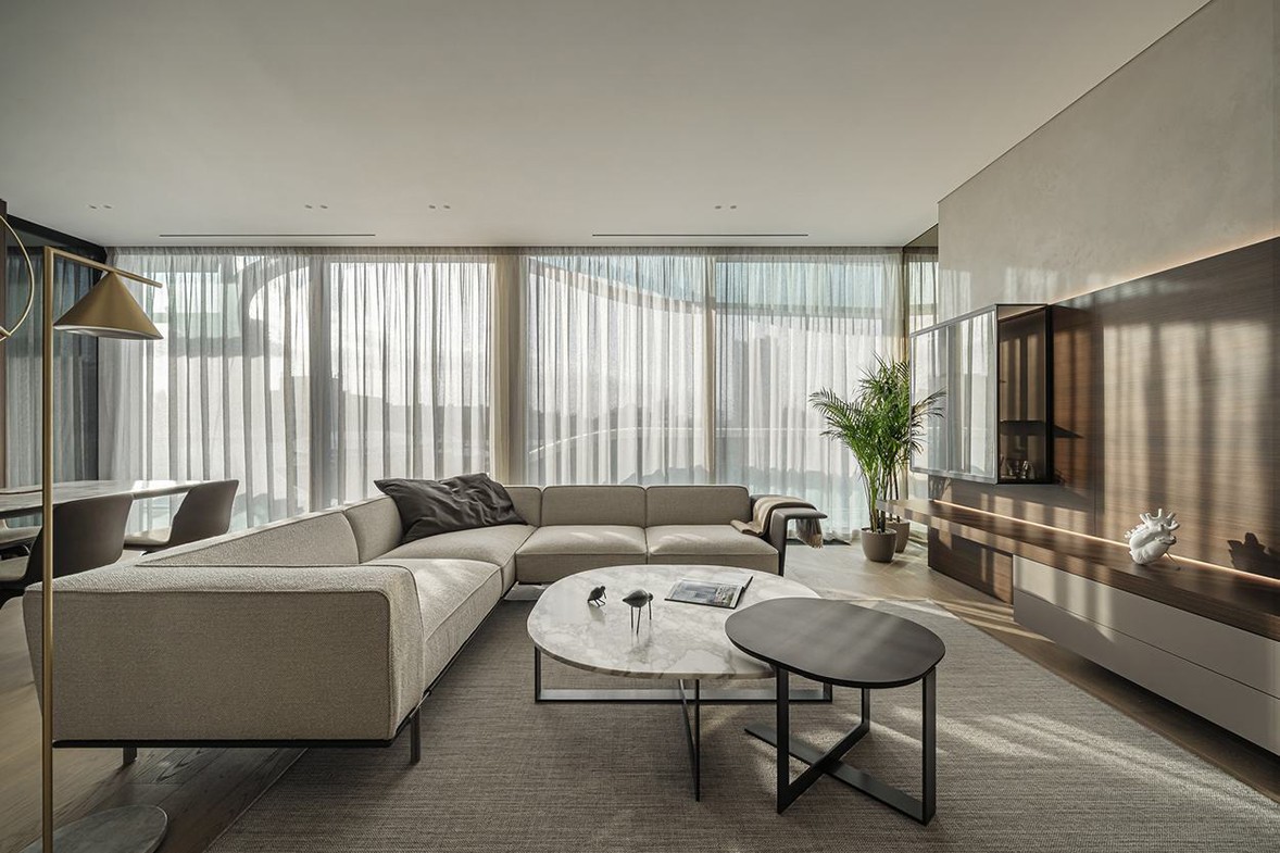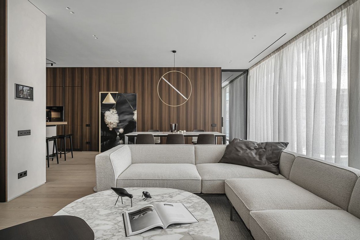Minimalist is the most simple visual aesthetics. The minimalist gray space highlights the delicate space through the texture of the material. Everywhere is filled with elegant tenderness. At first glance, it is methodical. The integrated space layout of guest and dining, concise lines and low-saturation color matching create a rich and full sense of hierarchy; the TV background wall with wood veneer, skin feel board and rock grain intersects neatly and neatly, bringing the space The livability and comfort of the hotel have reached full marks. The dark gray package, filled with warm wood, and gentle tones, quietly interprets the quiet, light and luxurious style. The orderly arranged custom cabinets seem simple, but in fact they are original. Inadvertently, you can find the extraordinary place of customization.
