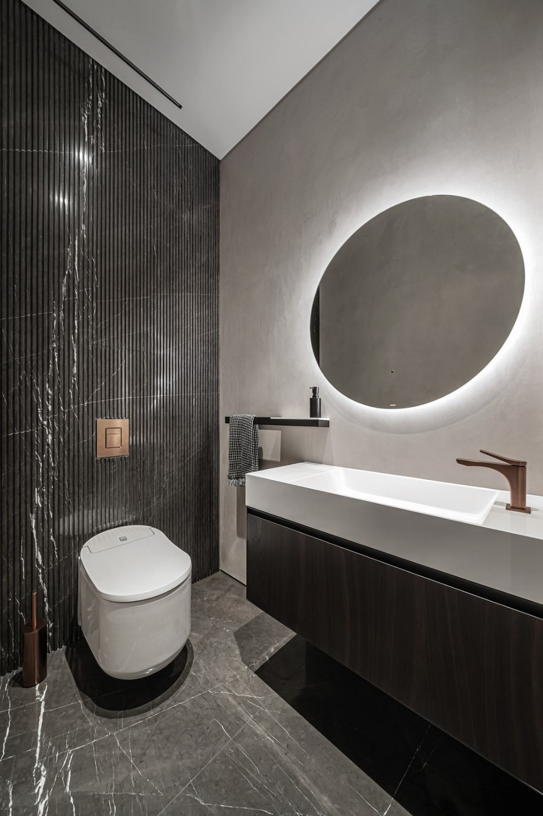 極簡是最為簡約的視覺美學,極簡的灰色空間,通過材質(zhì)的紋理突出空間的細膩,處處彌漫著淡雅的溫柔,一眼望去,有條不紊。客餐一體的空間布局,簡練的線條與低飽和度的配色,營造出豐富而飽滿的層次感;木飾面、膚感板與巖紋交匯的電視背景墻,干凈利落且清爽簡練,將空間的宜居性與舒適性拉至滿分狀態(tài)。深灰色的包裹,加以溫潤的木填充,溫和的色調(diào),安寧地詮釋靜謐輕奢的格調(diào),有序排布的定制柜,看似簡單,實則獨具匠心,不經(jīng)意間,發(fā)現(xiàn)定制的不凡之處。